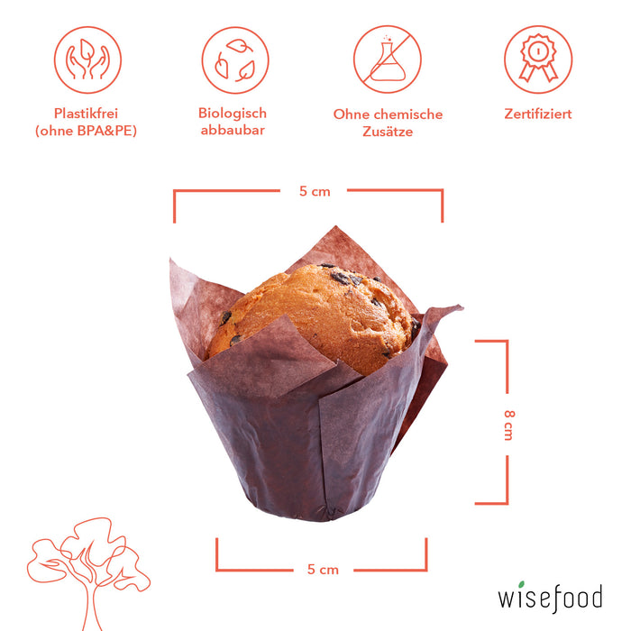 Very decorative brown tulip molds (approx. 8 cm) made of paper for baking tarts, small cakes, muffins and small baked goods. The baking mold is environmentally friendly, hygienic and decorative. Not only suitable for sweet, but also for savory.